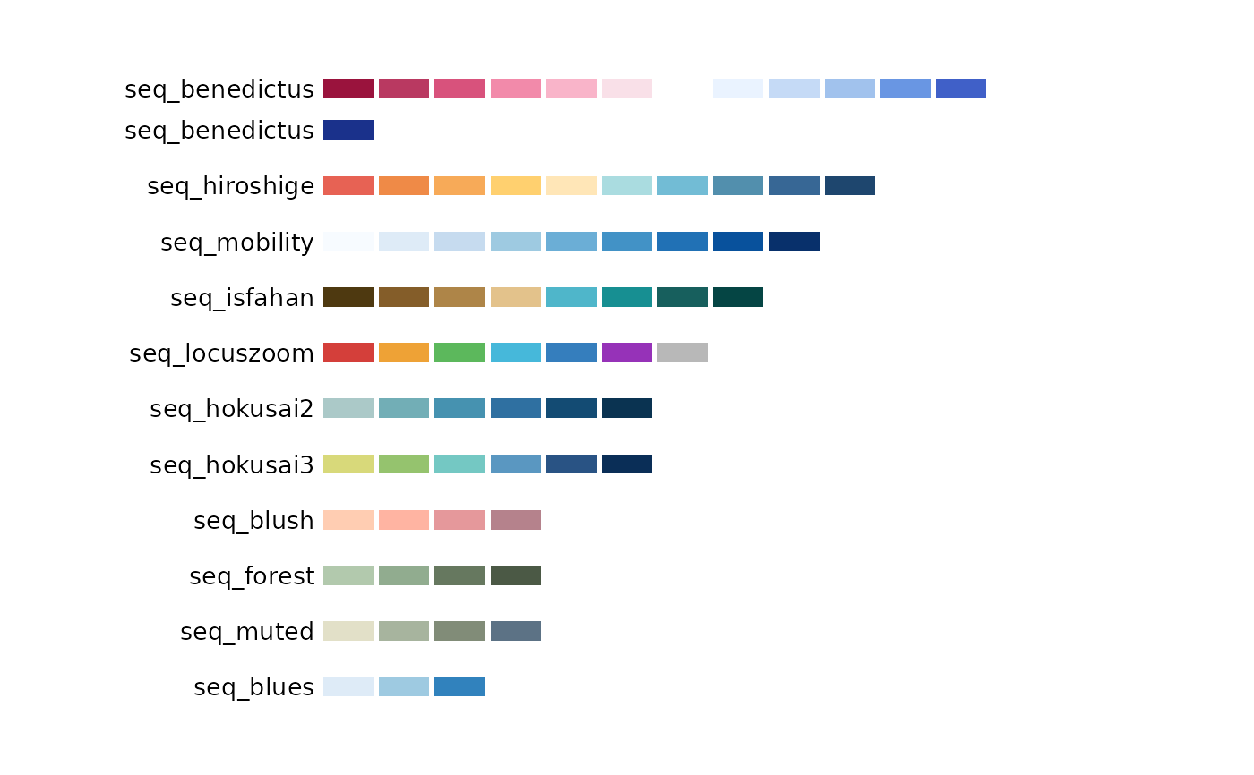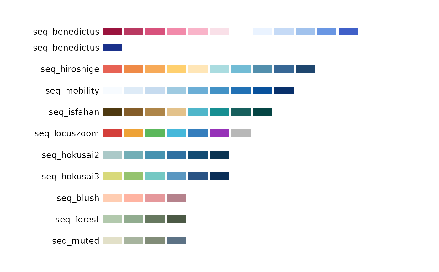 palette_gallery(type = c("sequential", "diverging"), max_palettes = 10)